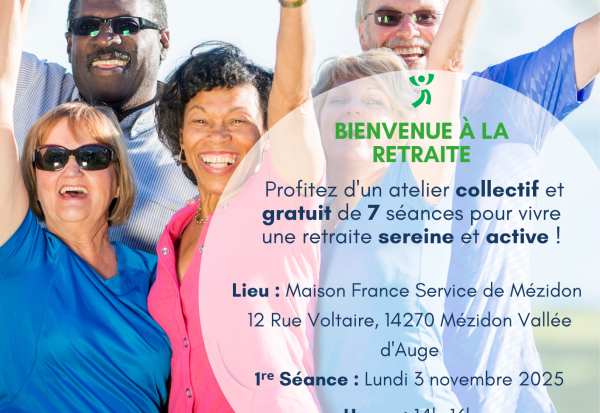 Futurs ou jeunes retraités, la Maison France Service de Mézidon Vallée d’Auge, en partenariat avec la Carsat Normandie, l’agglomération Lisieux Normandie et Neosilver, vous propose un parcours collectif gratuit de 7 séances pour bien vivre votre retraite, sereine et active.