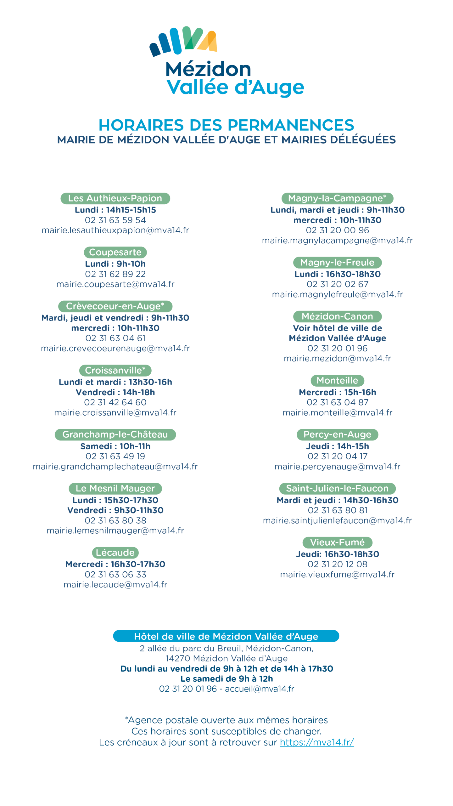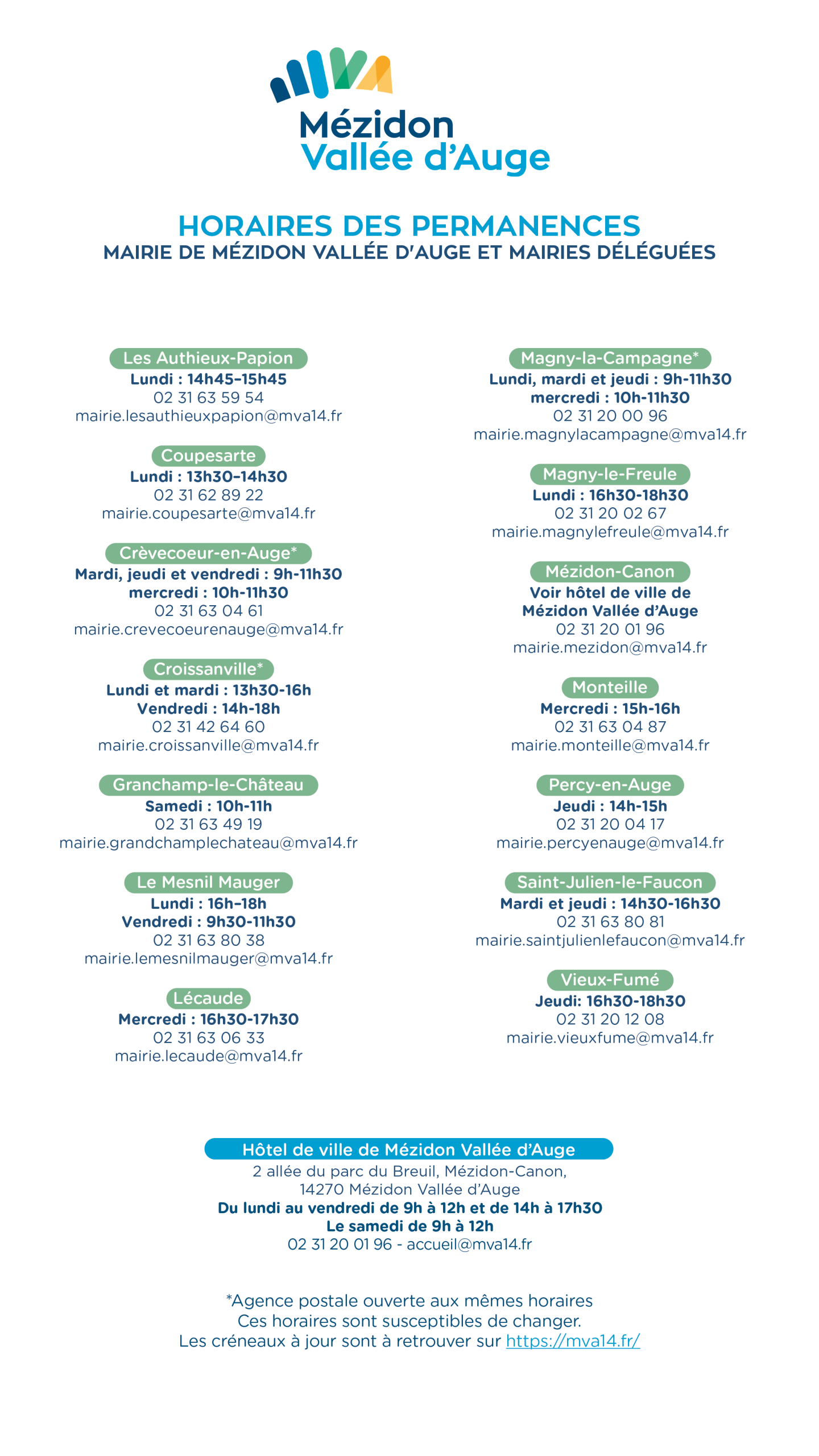 Pour faciliter vos démarches administratives, voici les horaires d’ouverture des mairies déléguées de Mézidon Vallée d’Auge. Chaque mairie propose des créneaux spécifiques pour vous accueillir et répondre à vos besoins.