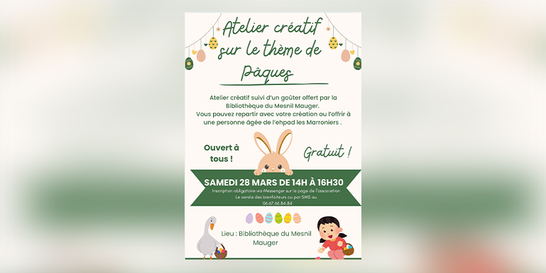 La bibliothèque du Mesnil-Mauger organise un atelier créatif autour du thème de Pâques, ouvert à toutes et tous. Cet événement vous permettra de repartir avec votre création ou de l’offrir à une personne âgée de l’EHPAD « Les Marroniers » !