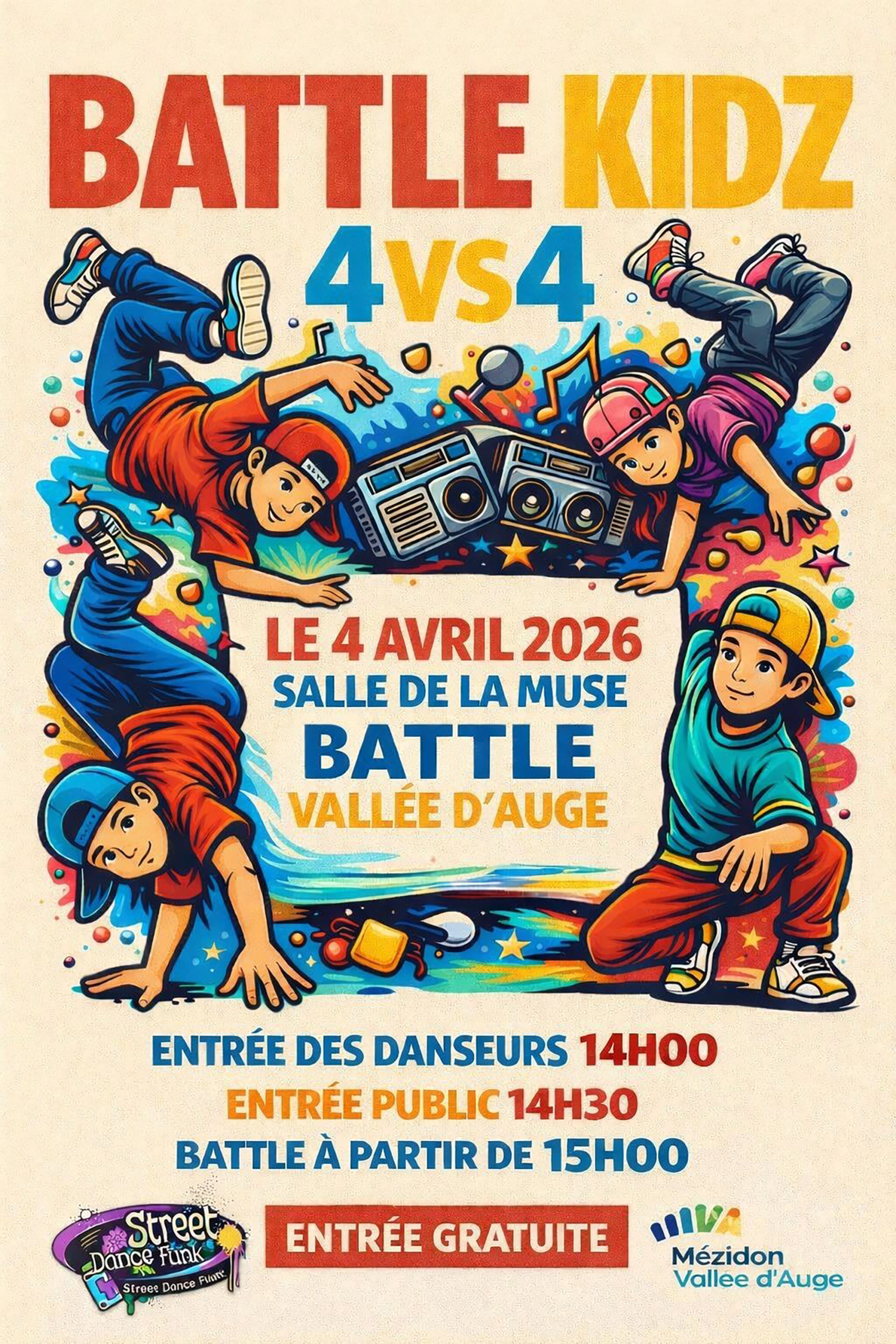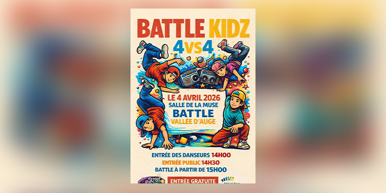 L’association Street dance funk organise un événement breakdance : le Battle Kidz 4vs4, le samedi 4 avril 2026 à la salle de la Muse, dans la commune déléguée de Mézidon-Canon.