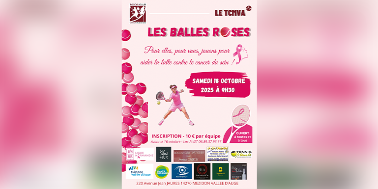 Le samedi 18 octobre 2025 à 9 h 30, le tournoi Les Balles Roses se tiendra au Tennis Club de Mézidon Vallée d’Auge (220 avenue Jean Jaurès).