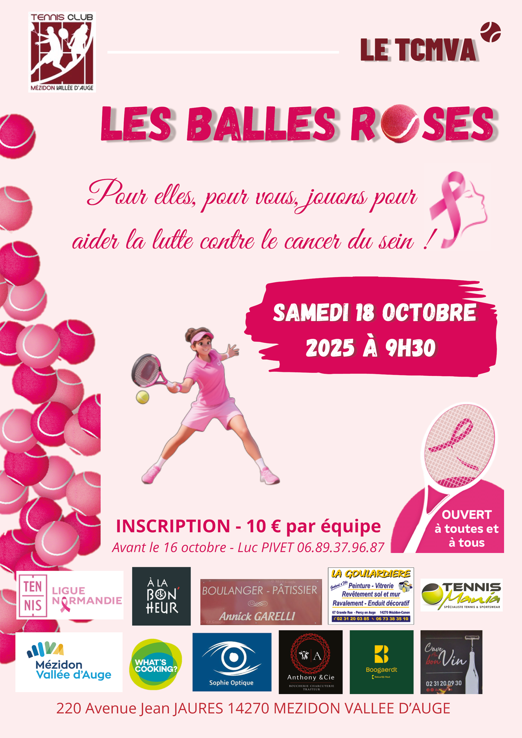 Le samedi 18 octobre 2025 à 9 h 30, le tournoi Les Balles Roses se tiendra au Tennis Club de Mézidon Vallée d’Auge (220 avenue Jean Jaurès).