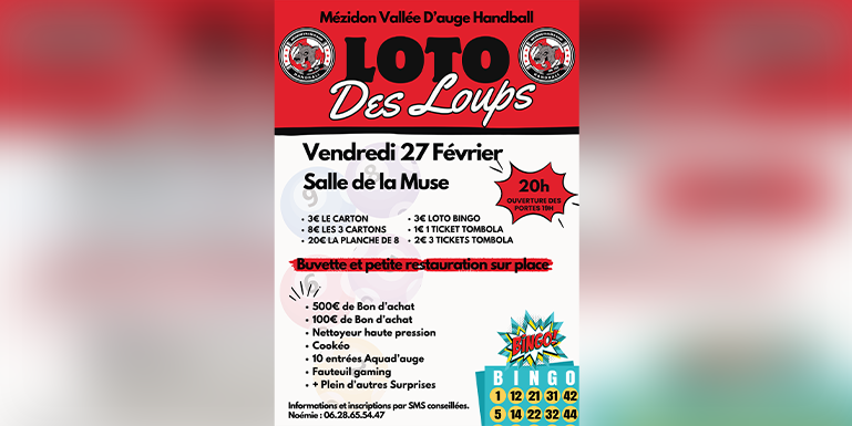 L’association Mézidon Vallée d’Auge Handball organise une soirée Loto le vendredi 27 février 2026 à la salle de la Muse :
