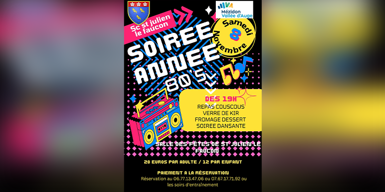 Le samedi 8 novembre 2025, à partir de 19 h, la salle des fêtes de Saint-Julien-le-Faucon accueille une soirée dansante sur le thème des années 80’s. Au programme : repas couscous, verre de kir, fromage dessert et soirée dansante…