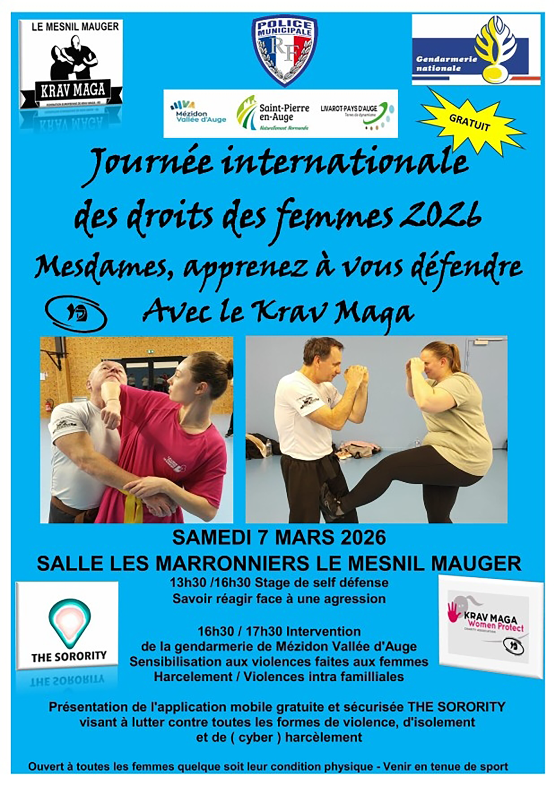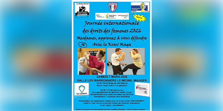 À l’occasion de la Journée internationale des droits des femmes, l’association Krav-maga Loisirs pour tous organise un stage de self-défense féminin le samedi 7 mars 2026 à la salle Les Marronniers, dans la commune déléguée du Mesnil-Mauger.